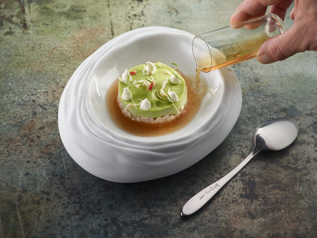 Centolla con aguacate Trops y yogur, un plato de Martín Berasategui