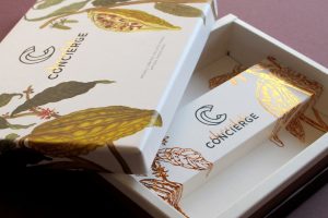 1. Chocolate Concierge: Diseño desarrollado por el estudio de origen húngaro Anagraphic (anagraphic.hu). En mi opinión este diseño sublima un recurso que empieza a ser recurrente en muchos productos, que es la ilustración tipo lámina floral con el fruto del cacao, pero que, en este caso combinando con la estampación en oro, funciona muy bien. Me atrae mucho el logo con la “C” en una especie de torsión imposible.