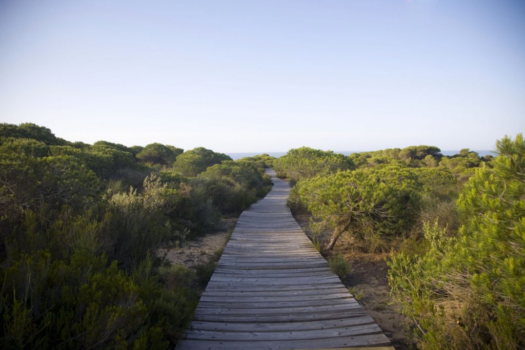 Los terrenos de viñedos de la Denominación de Origen circundan el perímetro del Parque Nacional, por lo que el cultivo de la vid está aquí sometido a una serie de restricciones que no se dan en otros parajes y que le hace ser una actividad no agresiva con el medio ambiente. Pero dentro del parque no hay vides, claro, sino marismas y bosques de pino y matorral mediterráneo que crecen en un suelo arenoso y donde se da la mayor concentración de biodiversidad de Europa. Casi toda la costa que va desde Matalascañas a Mazagón también forma parte del Parque, por lo que hay una buena colección de playas vírgenes en las que pienso terminar mi viaje. El punto final será el Parador de Mazagón, desde donde también prestan bastante atención al enoturismo y proponen diferentes actividades en colaboración con otras empresas.