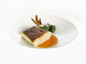 Merluza Asada, Hinojo Marino Encurtido, Hojas de Borraja y Consomé de Anguila