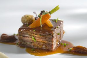 Pichón Asado y Reposado, Lascas de Chalota a La Parrilla, Tomate y Estragón