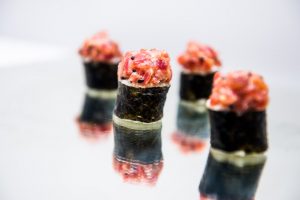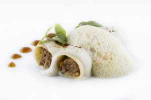 De Labra no solo cuenta con una sección en la carta para disfrutar de una de las carnes más exquisitas del mundo, producida además en Asturias, sino que también organiza jornadas gastronómicas específicas en las que probar las distintas elaboraciones. “Preparamos, por ejemplo, el steak tartar en la sala, como hacían en la Escuela de Hostelería de Barcelona, donde me formé, pero le damos un toque picante diferente, con perlas de mostaza nitrogenada, y salamos con algo de soja, que le va muy bien. Pronto propondremos también un carpaccio y con las partes menos nobles presentamos unas brochetas yakitoro con un toque de tomillo o una hambu