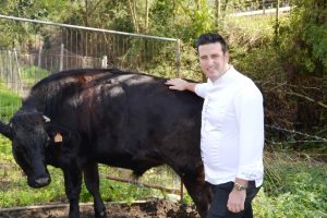 Se trata, por lo tanto, de una “pequeña reserva Wagyu”, donde los bueyes (“un verdadero prodigio genético”, asegura Miguel) viven felices y disfrutando de una alimentación t