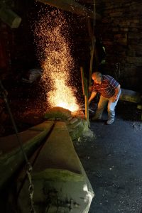 En el cercano pueblo de Besullo podemos seguir la pista de uno de los muchos útiles que fueron fundamentales en las tareas relacionadas con la vendimia y con la agricultura en general: el carro del país. Besullo fue tierra de ferreiros. En esta pequeña parroquia llegó a haber cuatro mazos, las herrerías donde, aprovechando la fuerza hidráulica de los ríos, se estiraban, ensanchaban o adelgazaban los lingotes de hierro para después, en las fraguas, elaborar todo tipo de instrumentos, desde sartenes a clavos. Los ferreiros de Besullo se especializaron en ruedas de carro (el llamado ‘carro del país’) y hoy, algunas de esas ruedas se pueden ver, convertidas en mesas, junto al bar del pueblo. También se puede ver en funcionamiento uno de los mazos, el Mazo d’Abaxu, el único que queda (recuperado y restaurado), junto al río Veigas.