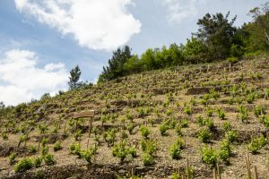 La ladera parece haberse cortado a mazazos para conseguir algún recodo horizontal donde plantar las vides pero se intuye que la labor fue ardua pues cada una de las cepas de la viña La Zorrina crece donde buenamente puede, en vaso, claro, sin seguir muchas hileras ni geometría que valga. Rodeada de bosques, orientada al sur y con una pendiente de más del 60%, esta parcela, además de un lugar maravilloso, es un buen ejemplo de la viticultura heroica a la que pertenecen los viñedos de la DOP Cangas, en Asturias.