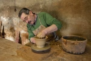 El alfar de Manuel Rodríguez, en Llamas del Mouro, es prácticamente el último que queda en toda Asturias donde se elabora la particular cerámica negra. De los veinte talleres que existieron en décadas pasadas, solo en este de Manuel sigue girando el torno (manual, se mueve a fuerza de pedaladas) del que salen cántaros (xarros de agua), ollas, fedideras (recipientes para hacer mantequilla), queseras, pucheros y otras piezas relacionadas con el vino como porrones, jarras y la versión en barro cocido de los cachus. Todos ellos, eso sí, son de un llamativo color negro o gris acerado cuyo secreto está en la cocción, o en la cochura, que es la palabra que se emplea en alfarería. Tras quince horas en el horno, tapadas con tierra y lamidas por el fuego de cepas de uces (brezo) o piornos (retama), las piezas pasan cinco días más pero esta vez con el horno completamente tapado. Así, el humo no puede salir y penetra en todos los poros del barro, transformándolo y dando a las vasijas el admirado color negro final.