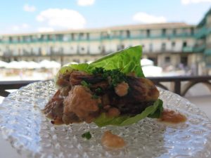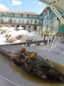 Hemos comprobado la esencias de esta interesante filosofía durante una reciente comida en la balconada de La Casa del Pregonero con vistas al bullicio de una Plaza Mayor de Chinchón que va adaptándose, paso a paso, a la “nueva normalidad” y que durante los fines de semana siempre ha ejercido como destino favorito para los aficionados madrileños a la cocina popular. Junto a los balcones, el luminoso patio castellano interior es otro espacio gastronómico magnífico.