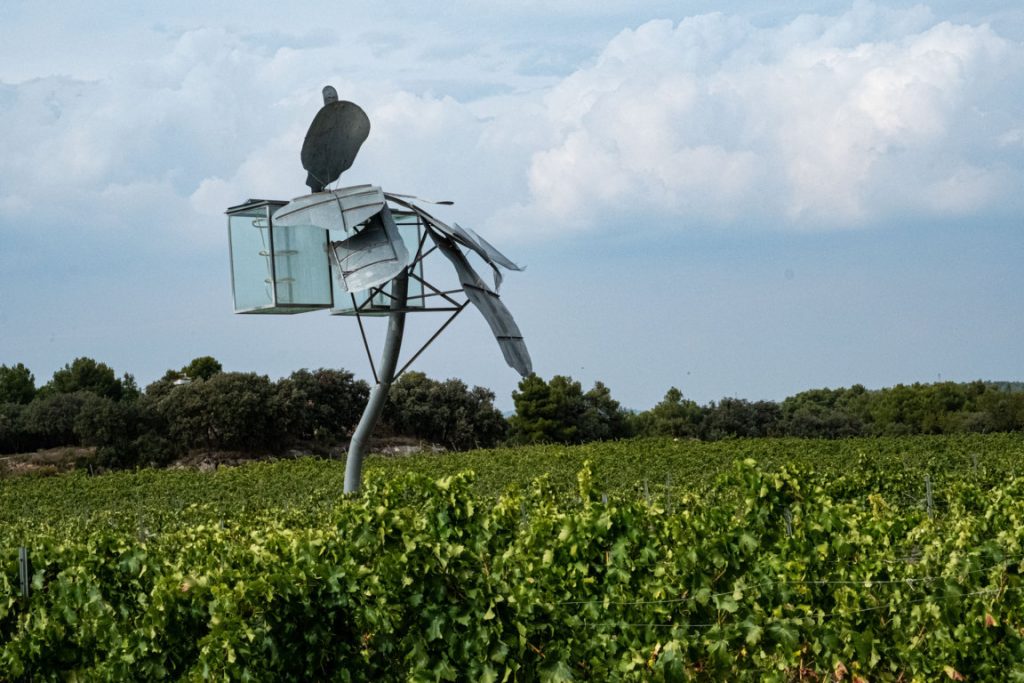 Pero si hablamos de arte en bodegas no podemos dejar de visitar Mas Blanch i Jové, en La Pobla de Cérvoles, una bodega familiar que elabora vinos ecológicos y de montaña y que puso en marcha un proyecto enoturístico fabuloso basado en la creación artística en diálogo con el paisaje, el viñedo y los vinos. Josep Guinovart, amigo de la familia, fue quien inició La Viña de los Artistas, una especie de galería de arte al aire libre donde las obras de diferentes creadores salen a nuestro encuentro en un recorrido por los viñedos, olivares y montes de la finca. Son esculturas e instalaciones de gran tamaño que llevan la firma de artistas como Carles Santos, Joan Brossa, Susana Solano, Evru, Frederic Amat, Assumpció Mateu, Esteve Casanoves, Carlos Pazos o Eva Lootz, entre otros. Dentro, en la sala de barricas, todavía queda una última sorpresa: el mural gigante de 60 metros que tapiza las paredes, pintado por Gregorio Iglesias Mayo en la Viña de los Artistas, de noche y de día, con sol, lluvia y nieve.