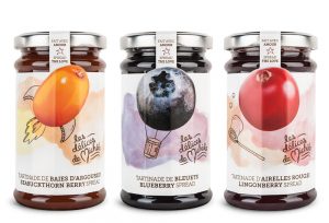 Les Délices de Michéle. Partiendo de una fotografía de producto que apuesta por lo natural sin artificios, combinada muy acertadamente con unas divertidas y sencillas ilustraciones y todo esto edulcorado con unos tibios fondos acuarelados, esta empresa canadiense consigue un acertadísimo y entrañable packaging que enamora desde el primer instante.