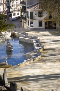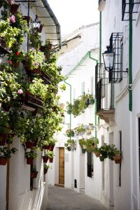 Otro de esos símbolos es, sin duda, el barrio de la Villa, la parte más antigua de la ciudad, de origen andalusí. Uno tiene que adentrarse aquí con la intención de perderse voluntariamente en este laberinto de calles retorcidas y casas de paredesblancas adornadas por cientos de macetas con geranios; vagar sin rumbo por estas callejuelas empedradas que en cualquier recodo sorprenden con una plazoleta donde se arremolina la luz y el azul del cielo; caminar sin prisa percibiendo el aroma de jazmines y atentos a detalles como la línea verde que marcan los canalones de agua en los tejados de las casas o el palo de caña del que cuelga una lata y que sirve para regar las macetas situadas a más altura…