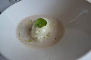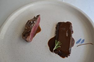 -Caldo cuajado de pato, pato ahumado y huevas de anchoa.