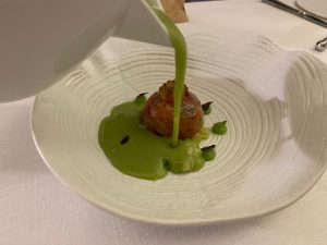 Gazpacho de tomatillo verde con carabinero de Huelva