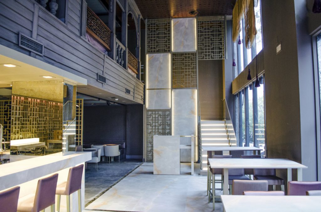La distribución en dos alturas, permite disponer de un espacio de lujo y ambiente chic-oriental a modo de salón principal con mesas, sofás y sillas de corte moderno en combinación con las piezas históricas, con una segunda planta donde el espíritu colonial alcanza su máxima expresión dando forma, color y ambiente a los espacios más íntimos del restaurante.