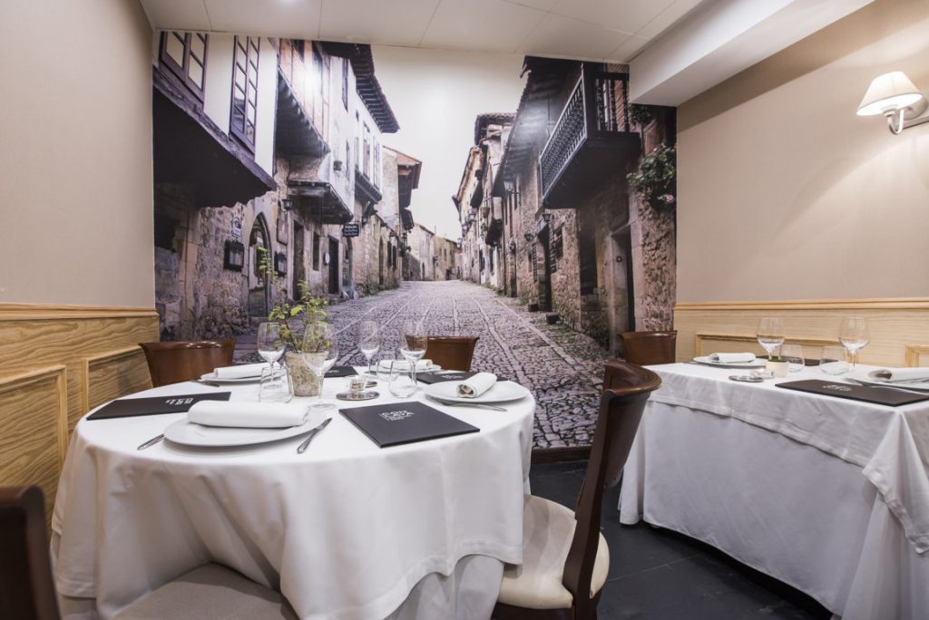En Conlaya ‘se respira’ Cantabria por doquier. Empezando por sus paredes, con cuadros, mapas y fotografías del siglo pasado de los pueblos y una que ocupa el fondo del salón principal y que sitúa al comensal en pleno empedrado de Santillana del Mar. Su suelo negro, imitando la tan abundante pizarra del norte, y los techos bajos, que dan calidez y ese carácter acogedor de sus paisanos, contribuyen a la sensación de estar como en casa. El conjunto es un restaurante íntimo, coqueto y elegante, con las mesas bien vestidas y una barra a la entrada donde esperar tomándose una copa o empezar con alguno de sus vinos (más de 60 buenas y asequibles etiquetas) o su interesante selección de vermuts.