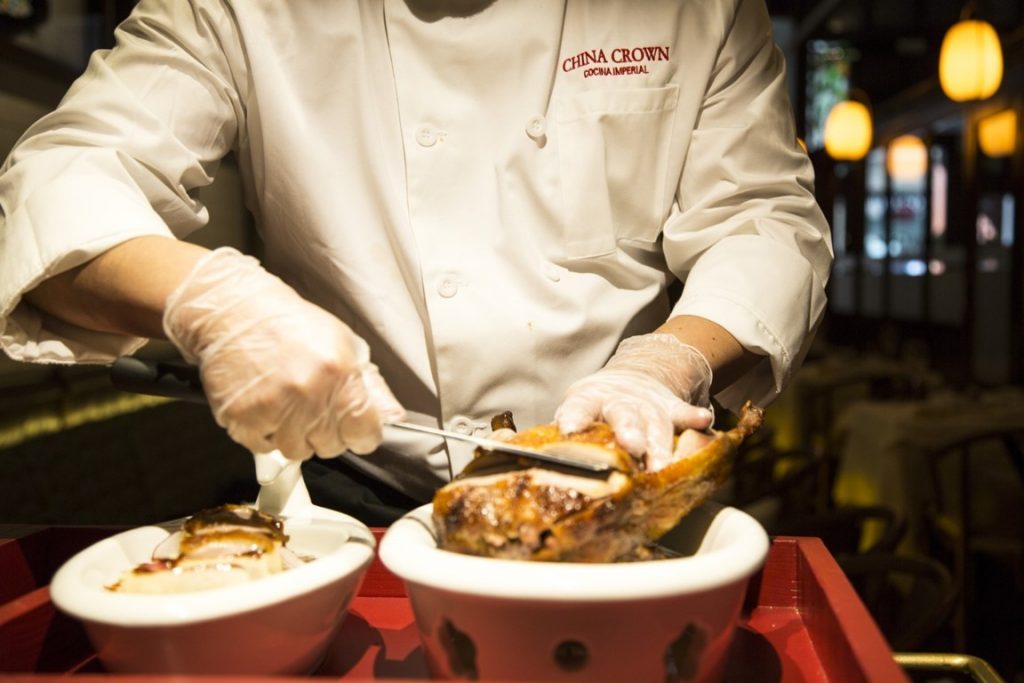 “Lo primero que se hace es limpiar el pato”, relata Wang. “Después, se rellena con nuestros mejores ingredientes y se macera con especias chinas. Seguidamente, se mete al horno durante cinco horas y se va sacando para bañarlo con la salsa Imperial China Crown”. Para concluir, y una vez el pato esté listo, Wang conseja sacarlo del horno y aplicarle por encima una capa de aceite caliente, concretamente, a una temperatura de 200ºC. “Así, la piel del pato queda crujiente”, apunta el experto. Para China Crown, el servicio en sala forma parte de su filosofía y éxito. Por eso, una vez cocinado, el pato laqueado se coloca muy cuidadosamente en un carrito. El restaurante de Casa Calvet cuenta también con un cortador profesional, que conduce el carrito hasta la mesa del comensal. Una vez allí, corta el pato laqueado en directo. “El plato tiene de 20 a 22 cortes, depende de lo grande que sea el pato”, apunta Wang.