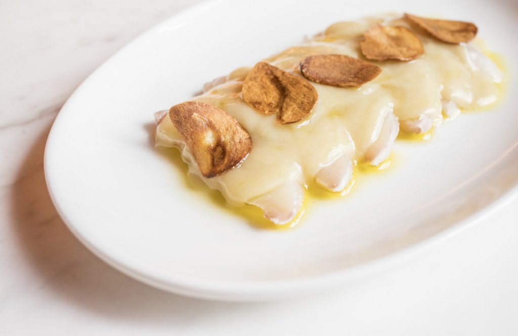 Guillermo Salazar interpreta la tradición y el sabor castizo en pleno barrio de las Salesas, donde disfrutar de raciones, cañas, vermuts y una cuidada selección de vinos que cuenta con caprichos y botellas de la casa. La carta de Casa Orellana (Orellana, 6. Madrid) la conforman elaboraciones populares y creaciones del chef sevillano que surgen de la fusión de su experiencia personal con los recetarios de siempre. En la imagen, la corvina macerada al ajillo, una de las recetas de Salazar.