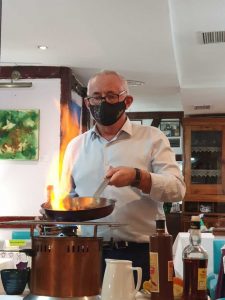 La carta de Dudua Palacio rinde homenaje al servicio de excelencia con su Menú La Leyenda del Tiempo. Juan Hernández de Blas (en la imagen preparando la Crêpe Suzette) lleva más de 35 años al frente de Dudua Palacio, restaurante situado cerca del Palacio Real de Madrid, en una zona hoy sometida eso sí a incómodas y prolongadas obras. Lo que empezó siendo un local de música y copas (de ahí su nombre, claro homenaje a ese estilo de música nacido de la unión del rhythm & bl