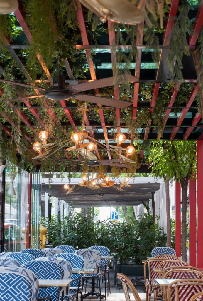 Asentado en plena Plaza del Marqués de Salamanca de Madrid, el restaurante Martinete amplía su espacio y traslada la esencia del interior a la calle en su nueva terraza como continuidad del trabajo realizado por el reconocido interiorista Lázaro Rosa-Violán. Una esencia donde lo natural e industrial se unen en perfecta armonía para aportar un inmejorable confort y ambiente. De esta forma, la terraza mantiene el gusto de los clubs privados, con toques retro renovados en los que el mármol y el cristal hacen lucir las mesas, acompañadas por sillas tapizadas o realizadas de mimbre natural. Todo ello sobre una tarima de madera y una decoración con plantas en el techo que le dan un bonito y envolvente toque de frescor.
