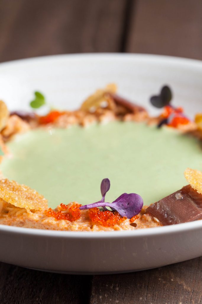 Ubicado en Alcuneza, una pedanía de Sigüenza, el Relais & Châteaux Molino de Alcuneza bebe de la historia y la tradición del establecimiento con más de 500 años de antigüedad para realizar su carta. Se trata de una cocina de recetas clásicas y basada en productos de la zona y de temporada, con una bodega compuesta principalmente por vinos castellano manchegos. En la imagen, su ajoblanco de pistachos.