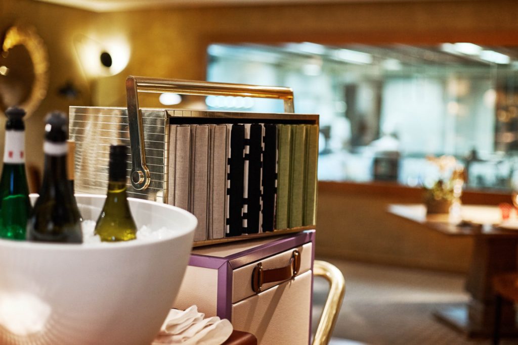 Este carrito transporta toda la experiencia vinícola de Santceloni. Diseñado por Gabriel Corchero Studio recrea los carros con equipaje que se veían en las estaciones de trenes del siglo pasado. Está compuesto por un mueble-baúl contenedor de copas y utensilios para el vino y otro destinado al almacenamiento de botellas, ambos transportados en un carro. Cuenta con un enfriador con capacidad para albergar entre 10 y 14 botellas aproximadamente y una caja para guardar las cartas de vino.