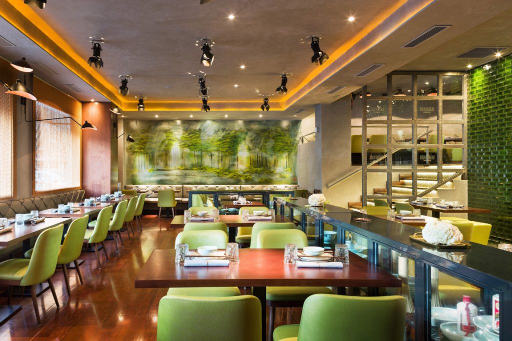 En cuanto al espacio, está decorado de forma ‘casual’ actual, donde predomina la madera y los verdes en las sillas, los azulejos que enmarcan la espectacular cocina vista con el equipo a pleno rendimiento dentro, y la ‘vegetación’ que adorna el restaurante simulando un bosque a modo de fresco. También hay otros elementos modernos que rompen con la estética en ciertos rincones, como una bicicleta y un cartel de neón haciendo homenaje al Shanghái más callejero. Un estilo muy alejado del típico restaurante oriental que hace muy agradable la estancia a cualquier tipo de público y especialmente acogedor para celebrar reuniones de grupos o eventos personalizados según las necesidades del cliente.
