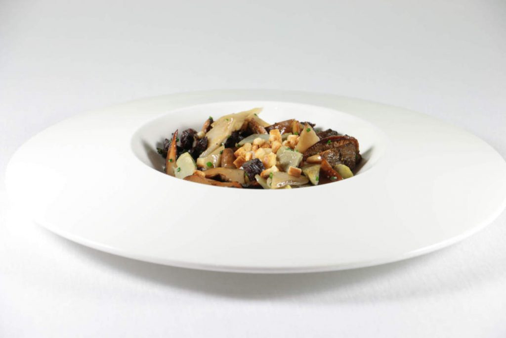 Trompetilla negra, angula de monte y setas de cardo son sólo algunas de las setas que podemos disfrutar con la llegada del otoño en Apicius, el referente gastronómico en la ciudad de Valencia. En la imagen, salteado de setas, alcachofa y huevo, una de las recetas.