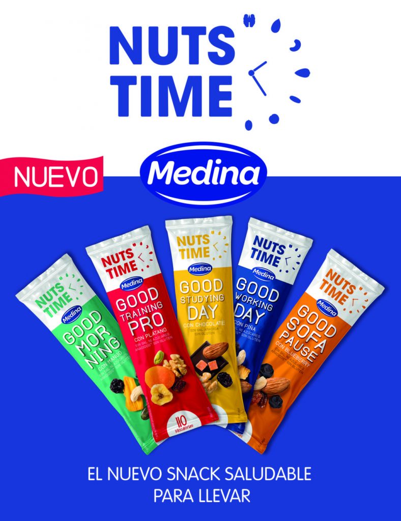 La empresa Aperitivos Medina ha apostado por liderar la renovación del fruto seco, convirtiéndolo en un aliado de la nutrición. Para ello ha desarrollado una nueva marca, Nuts Time, que potencia las bondades del snack saludable. Se trata de una nueva propuesta con 5 variedades para distintos momentos del día y que marcará tendencia: sin sal añadida, con 3 referencias sin azúcares añadidos y 2 con una mínima cantidad para conseguir un mejor sabor, en formato monodosis de 25 gr -los nutricionistas recomiendan la ingesta de entre 20 y 30 g diarios de frutos secos- y con un límite controlado de calorías de entre 110 y 120 por paquete.