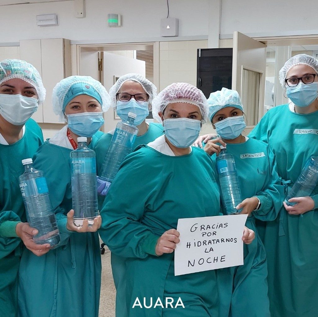 Auara es una empresa social que comercializa agua mineral y destina el 100% de sus dividendos a proyecto de acceso a agua potable en países en vías de desarrollo, pero lleva cinco semanas donando agua embotellada a personal sanitario y pacientes de coronavirus de hospitales, residencias de mayores, hoteles medicalizados y centros asistenciales de todo el territorio nacional, a través de sus propios recursos y con el apoyo de una campaña de crowdfunding.
