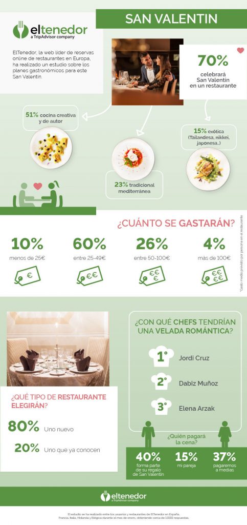 Según una encuesta de ElTenedor, el 66% afirma que celebrará San Valentín este año y un 84% confirma que lo hará con una cena romántica en un restaurante. Según ElTenedor, se espera que las reservas online de restaurantes crezcan un 20% con respecto al año pasado. En cuanto al presupuesto, este año están dispuestos a gastarse más que en sus cenas habituales y dedicarán hasta 50€ a este día especial. La cocina creativa y de autor es la más demandada para la cena de san Valentín. El Celler de Can Roca o Diverxo son los restaurantes con los que sueñan los enamorados y Jordi Cruz, Dabiz Muñoz o Elena Arzak los chefs elegidos para una velada romántica.