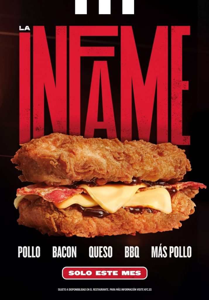 La Infame de KFC estará disponible durante un tiempo limitado en todos los restaurantes de la cadena. “La Infame supone un antes y un después en el concepto de hamburguesa tal y como la entendemos hoy en día. Estamos muy orgullosos de poder darle el protagonismo a nuestro producto estrella, el pollo frito. Esto es Pollo Pollo, pero de verdad”, señala el Señor Pollo Pollo, de KFC.