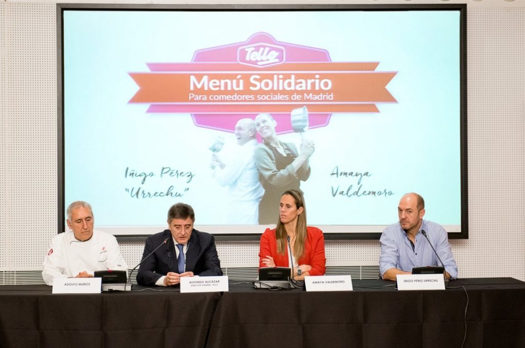 En Madrid, más de 825 menús que se repartirán en los comedores sociales de la capital, se han presentado esta mañana en dependencias del Ayuntamiento de Madrid por parte de las personas encargadas de diseñar los mismos: el televisivo chef Íñigo Pérez “Urrechu” (Urrechu, El Cielo de Urrechu y A’Kangas by Urrechu), el Premio Nacional de Hostelería Adolfo Muñoz (Restaurante Palacio de Cibeles de Madrid) y la ex jugadora de baloncesto Amaya Valdemoro.