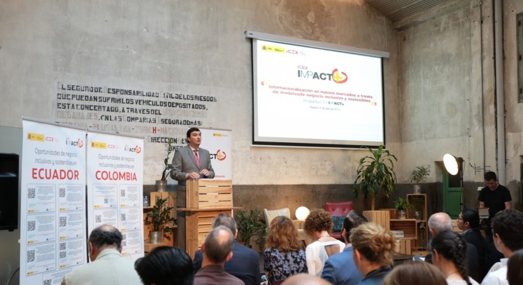 El programa piloto para Colombia y Ecuador ofrece a las empresas oportunidades concretas, acompañamiento personalizado y asesoramiento en la puesta en marcha del negocio. Alrededor de 4.000 millones de personas viven con ingresos por debajo de los 3.000 dólares anuales, cuyas necesidades deben ser atendidas en condiciones adaptadas. En la imagen, Francisco Javier Garzón, consejero delegado de ICEX durante la inauguración de la jornada en la que se presentó ICEX IMPACT+