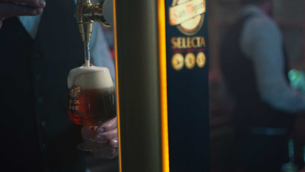 A través de este nuevo spot, la marca ha querido reflejar la inquietud cervecera que le ha acompañado desde sus orígenes, 1890, con el fin de buscar los mejores ingredientes, procesos y orígenes. El anuncio transcurre en varios locales donde se suceden imágenes de cervezas llenas y vacías, dejando claro que Selecta está igual de buena del primer al último sorbo. El secreto de Selecta de San Miguel reside en su elaboración donde las maltas, con tres niveles distintos de tostado, le aportan los toques y el aroma tan característicos de este cereal. Igualmente, el proceso de maduración en frío, ayuda a integrar dichos aromas que, junto a los sabores, dan como resultado una cerveza elegante y llena de matices y que mantiene su excelente sabor hasta el final.