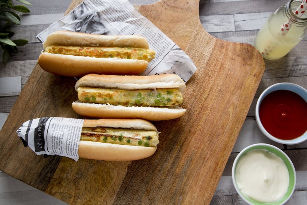 Sacar del agua, escurrir, desenvolver del papel con cuidado y meter entre dos panes de perrito tostados.