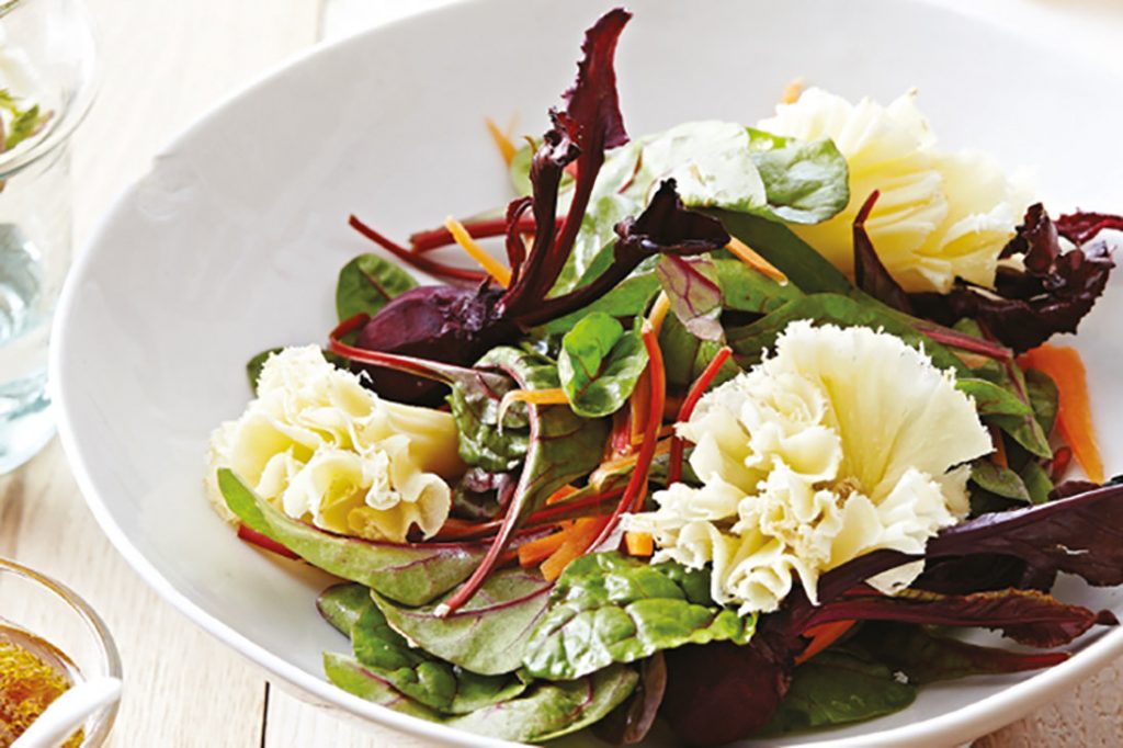 Una forma fácil de dar sabor y naturalidad a tus platos más frescos. Porque las propiedades del queso suizo completan los platos de forma saludable y apta para todos los paladares. En la imagen, una ensalada de remolachas, zanahorias, vinagreta de naranja y rosetas de Tête de Moine AOP