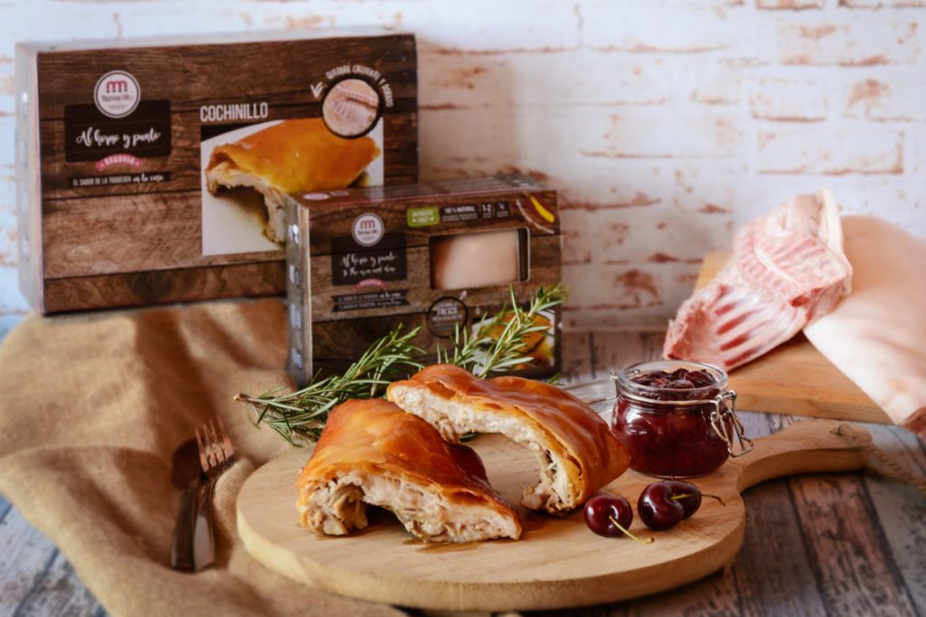 “Al horno y punto” es un pack que recoge un cuarto de cochinillo fresco que, siguiendo tres sencillos pasos para su horneado, puede ser disfrutado en casa. Destaca su carácter saludable dado que se trata de cochinillo alimentado únicamente con leche materna y al que tan solo se ha añadido una pizca de sal.