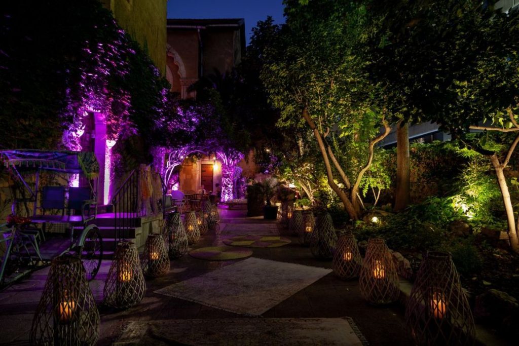 misterio y romanticismo. En el paso al patio se encuentra la barra de bar metálica que simula antiguas chapas de estilo victoriano. Por la noche, la iluminación en magenta es la gran protagonista, junto con el gran rosetón de la iglesia, iluminada desde el interior y lugar desde donde el DJ ameniza las veladas. Todos estos elementos conviven con la frondosa vegetación propiedad del edificio.
