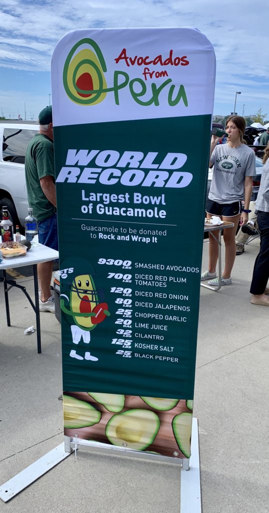 Este domingo 8 de septiembre, la Organización Mundial del Aguacate (WAO, por sus siglas en inglés) tuvo el honor de ser elegida por los New York Jets y Aguacates del Perú para certificar el que se ha convertido ya en el bol de guacamole más grande del mundo. Este récord tuvo lugar durante el descanso del partido inaugural de la temporada 2019-2020 de fútbol americano, celebrado en el estadio MetLife (Estados Unidos) en el que jugaron los New York Jets ante más de 85.000 personas.