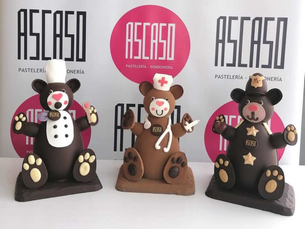 A las monas tradicionales, con forma de barco, helicóptero, casita y, sobre todo, de huevo, se suman este año unas creaciones más especiales: “Son unos ositos muy simpáticos caracterizados de esas profesiones que tan importante han sido siempre y este año se han valorado más. Eso sí: todas tienen el denominador común de ser cien por cien naturales, sin colorantes artificiales ni conservantes en su receta, de tal manera que los colores que muestran son los de las diferentes variedades de chocolate utilizados en su elaboración o los derivados de su mezcla con leche. Tampoco contienen gluten. Son piezas únicas elaboradas de una en una con la maestría de nuestros pasteleros, donde trabajamos el chocolate desde hace más de 40 años”, concluye Sura Ascaso.