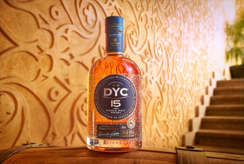 DYC Doble Roble es un single malt de doble envejecimiento en barricas de roble elaborado con materiales reciclados. DYC 15 (en la imagen) es un single malt de 15 años de envejecimiento que rinde homenaje a Nicomedes García en el 60 aniversario de DYC.
