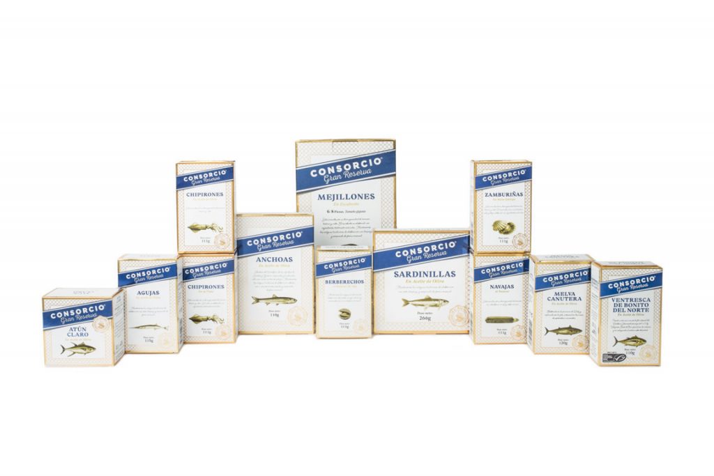 La familia ‘Consorcio Gran Reserva’ está formada por una selección de productos frescos de temporada envueltos en coberturas naturales sin conservantes ni colorantes, en categorías y formatos variados de anchoa, ventresca, atún y bonito del norte, junto con una nueva gama de referencias como navajas, sardinas, mejillones, berberechos, zamburiñas, chipirones en su tinta y en aceite de oliva, melva y caballa entre otras. Los productos provienen de Cantabria, las rías gallegas o del Atlántico, y cuentan con su propio sello de origen para garantizar su procedencia y pesca artesanal.