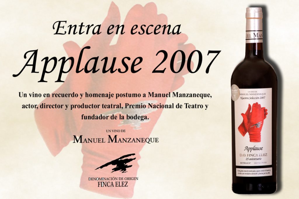 ¿Por qué Applause? Porque después de la escena viene la ovación. La etiqueta de esta añada especial quiere ser un recuerdo y homenaje al fundador de la bodega, Manuel Manzaneque, actor, director y productor teatral, Premio Nacional de Teatro, fallecido el año pasado. Homenaje de su familia y de la D.O. Finca Élez al actor, director, bodeguero, hombre y artista