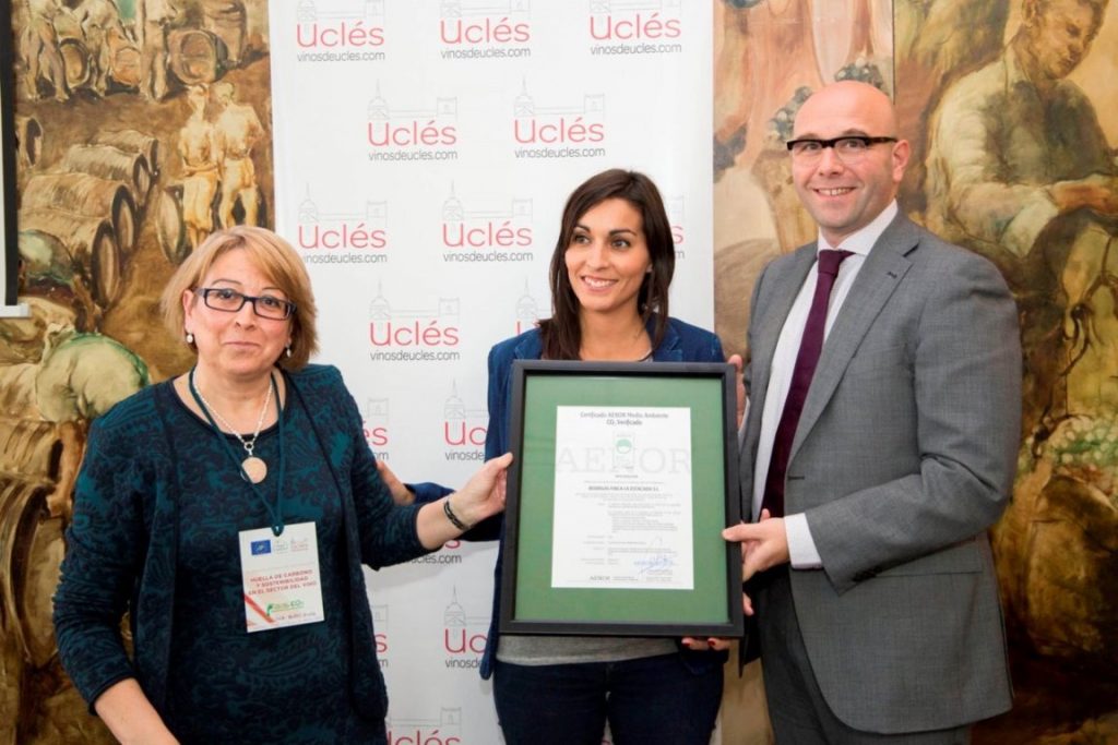 AENOR, la entidad de certificación de referencia en España, ha concedido a diferentes bodegas de la Denominación de Origen Uclés los primeros certificados conforme al nuevo esquema Wineries for Climate Protection (WfCP), elaborado por la Federación Española del Vino (FEV). Este certificado acredita la sostenibilidad medioambiental de las bodegas y se obtiene tras superar con éxito la auditoría de un tercero independiente. AENOR es entidad de certificación reconocida por la FEV para la realización de las auditorías, habiendo concedido los primeros certificados a Bodegas Finca la Estacada (en la imagen, recibiendo el reconocimiento), Bodegas y Viñedos Fontana y Bodegas Nuestra Señora La Soledad, de la D.O. Uclés.
