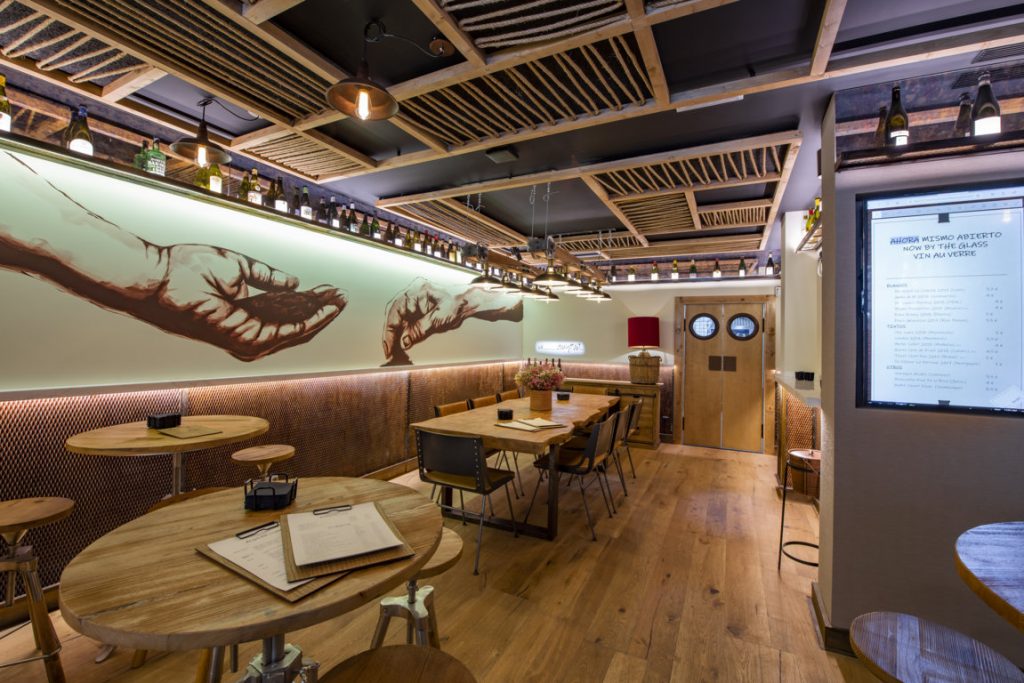 En cuanto al espacio, un acogedor semisótano decorado con colores claros, el cliente se topa, nada más entrar, con una imponente cava de vinos, y una confortable barra. Hay mesas altas que no admiten reservas y una mesa grande, para 8 personas, con la posibilidad de ser reservada.