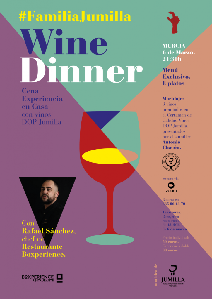 Se trata de un ciclo de eventos virtuales donde ofrecen una cena exclusiva para disfrutar desde casa, y compartirla con las recomendaciones de un chef invitado y un sumiller. La primera “Familia Jumilla Wine Dinner” se celebrará el próximo sábado 6 de marzo, y será retransmitida en directo desde Murcia. Contará con un menú del chef Rafa Sánchez, del restaurante Boxperience, armonizado con una selección de 3 vinos premiados en el 26 Certamen de Calidad vinos DOP Jumilla, por el sumiller Antonio Chacón. La acción forma parte de la campaña Familia Jumilla, dedicada a mostrar apoyo a hosteleros, sumilleres y chefs de toda España.