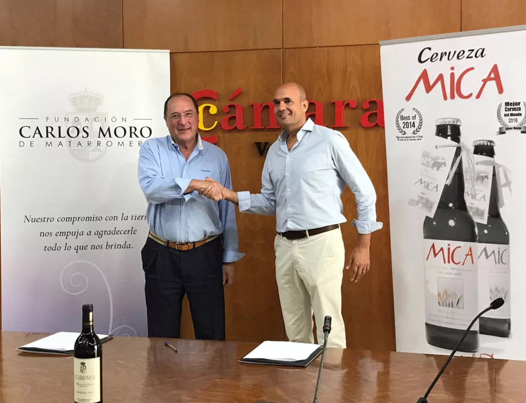 La Fundación Carlos Moro de Matarromera y Cerveza Mica han suscrito un convenio de colaboración, a través del cual la entidad presidida por el bodeguero y empresario vallisoletano colaborará con la empresa cervecera ayudándola con diferentes actividades y acciones que potencien su crecimiento empresarial así como en la investigación y desarrollo de nuevos productos de la más alta calidad. El acuerdo, suscrito entre Carlos Moro y Juan Cereijo, presidente del Patronato de la Fundación y fundador de Mica, respectivamente (ambos en la imagen), persigue apoyar a los emprendedores que desarrollan su actividad en el entorno rural y en este caso en concreto en la Ribera del Duero, objetivo primordial de la Fundación.