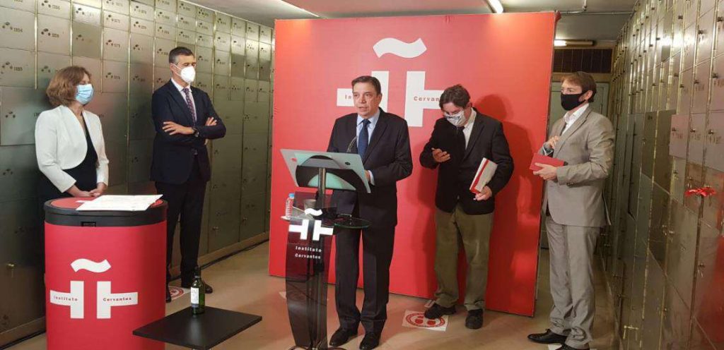 El ministro de Agricultura, Pesca y Alimentación, Luis Planas, ha participado en la apertura de la Caja de las Letras, donde el Instituto Cervantes y la Federación Española del Vino (FEV) depositaron en junio de 2018 el manuscrito original del poema “Oda al Vino”, del escritor chileno Pablo Neruda. Coincidiendo con la renovación del convenio de colaboración entre ambas instituciones, se ha procedido a depositar un legado en homenaje al centenario del nacimiento de Mario Benedetti.
