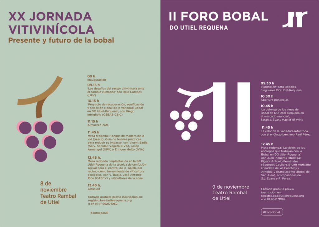 12.45 h Mesa redonda: ‘La visión de los enólogos que trabajan con la Bobal en DO Utiel-Requena’, con Juan Piqueras (Bodegas Pigar), Antonio Fernández (Bodegas Covilor), Bruno Murciano (Caudete de las Fuentes) y Arnoldo Valsangiacomo (Bobal de San Juan), acompañados de S.J. Evans y R. Pérez.
