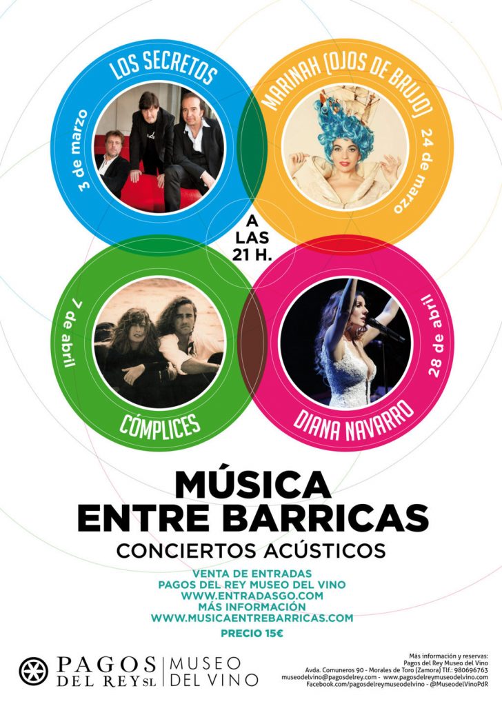 La espectacular sala de crianza de la bodega Pagos del Rey volverá a ser un escenario de excepción para los conciertos acústicos de su ciclo ‘Música entre Barricas’, que contará esta primavera con artistas del nivel de Cómplices, Los Secretos, Diana Navarro y Marinah (ex Ojos de Brujo). El programa se inicia mañana, 3 de marzo, con Los Secretos.