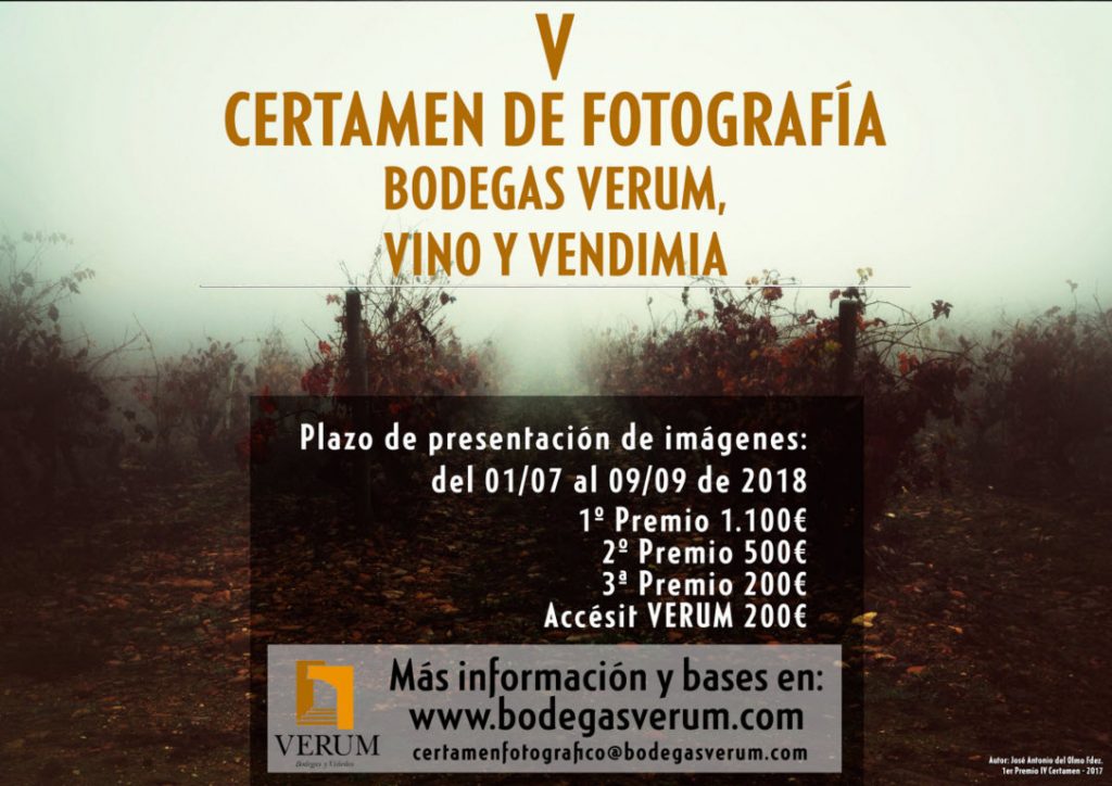 La V edición del Certamen Fotográfico Nacional que organiza Bodegas Verum se centrará en la diversidad paisajística y valor medioambiental del viñedo. Los certámenes anteriores suman más de 2000 fotografías procedentes de todas las regiones españolas. Para esta V edición la bodega ha preparado dos actividades para fotógrafos en viñedos, una para el envero (exaltación del color) y otra en vendimia.